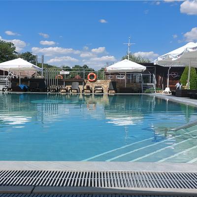 Тёплый бассейн из нержавеющей стали: натуральная термальная вода без добавления реагентов4*3 м и высота 55 см, объём 5,6 м³ с комфортной температурой (как в основном бассейне – по погоде), полный водообмен всего за 40 минут